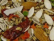 Medium Grey Sunflower, Hemp Seed, Paddy Rice, White Proso Millet, Carrot Dices, Hulled Pumpkin Seed, Cantalope Seed,Whole Wheat, Buckwheat, Oat Groats, Red Proso Millet, California Fruit Medley(Sun-dried Apricots, Nectarines, Pears, Peaches, Golden Raisins, Black Currents, Cranberries), Deluxe Trail Mix, Shelled Almonds, Coconut Chips, Dehydrated Green Peas, Chili Peppers, Sesame Seed, Papaya and Pineapple Dices, Red Bell Pepper Dices, Apple Wedges and Orange Oil (Vitamin C used as natural preservative). Note: this diet is not vitamin- fortified due to special Eclectus metabolic requirements.This website is a participant in the Amazon Services LLC Associates Program, an affiliate advertising program designed to provide a means for sites to earn advertising fees by advertising and linking to amazon.com