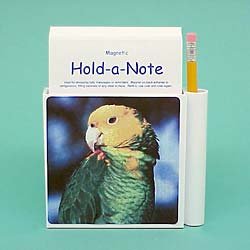 Ideal for shopping lists, messages or reminders, the Parrot hold-a-note is great for the home or office. With a strong magnet on the back, the Parrot notepad adheres to refrigerators, filing cabinets or any steel surface. Each Parrot note pad comes with paper and a pencil, it's reusable, just refill with more paper when needed. Approximate size on the Parrot hold-a-note, with paper, is 4.25 x 5.25 x 1 inch.
